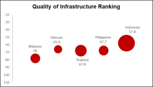 Indonesia’s quality of infrastructure may not be the most sophisticated in the region, but it is comparable to other ASEAN emerging markets. The chart below provides a comparative