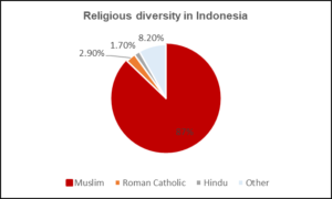 Religious diversity is also an important component of Indonesian society. Even though about 87% of the Indonesian population practices Islam, Indonesia is a secular country that does not have a single state religion. Apart from Islam, Protestantism, Catholicism and Hinduism are the three major religions adhered to by the Indonesian people. The chart below provides the segmentation of Indonesia’s population by religious group and, thus, offers a look into the country’s religious diversity. To learn more about Indonesia’s religious diversity, follow the link below: