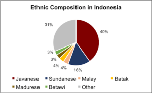 Ethnic and religious diversity – Indonesia is home to several different ethnicities spread across its vast geographic expanse. As indicated in the chart below, the Javanese form the nation’s largest ethnic group, constituting over 40% of the country’s population as of 2010, and they are followed by the Sundanese and Malay communities who come in at second and third place respectively. The chart below also illustrates the tremendous ethnic diversity that exists in Indonesia. There are so many small ethnic groups across the country that together they constitute over 31% of the population but individually each group comprises less than even 3%. To read more about Indonesia’s different ethnic communities, follow the link below: