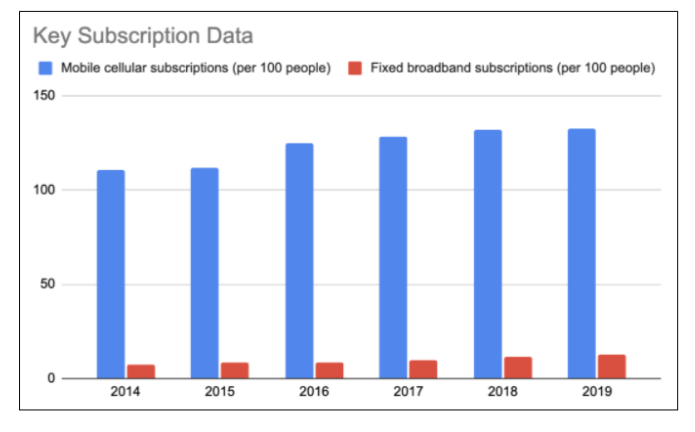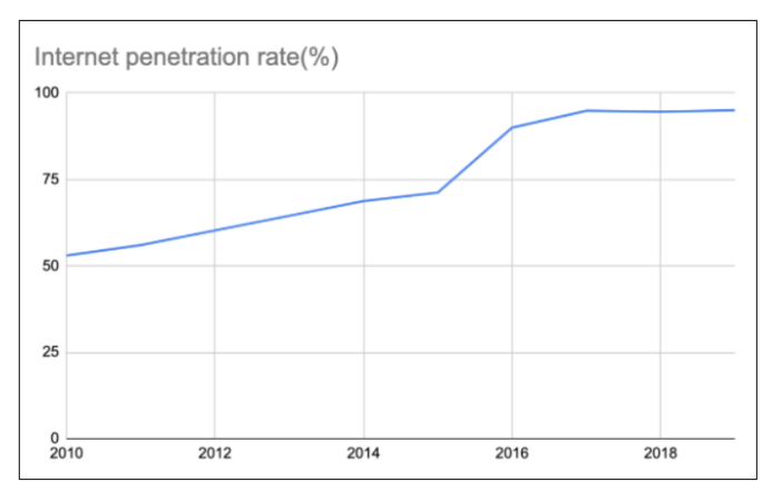 Internet Penetration Rate – – As of 2019, the rate of Internet Penetration lies at 95.0%. From the following charts it is observed that Internet Penetration rate has grown substantially in the years 2010-2017. The economy has observed an increase of 79% in internet penetration between these years. The Chart 1 shows continuous growth over the years. From second chart it is established that Brunei has the highest IPR in the ASEAN region, followed by Singapore. The IPR of Brunei is 3x more than that of Myanmar.