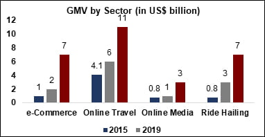 The graph below indicates the distribution of the digital economy based on the aforementioned segments. It is notable that though the e-commerce sector has shown little growth in the past, it along with the online travel industry are projected to grow the most in the upcoming years.