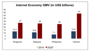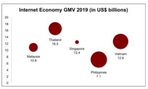Despite being a small nation, Singapore has a relatively larger internet economy than most of its regional peers. The chart below depicts the 2019 GMV of a few ASEAN nations, with the bubble size based on population density / with its predicted value in 2025.