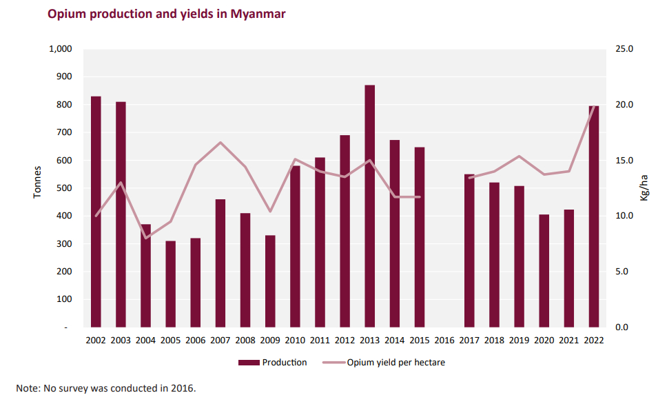 But the situation reversed in 2021 when the military took power in Myanmar. The social-economic and governance disruptions caused a 33% increase in poppy cultivation in 2022. Eradication efforts also decreased, leading to locals growing poppy for economic sustenance.