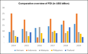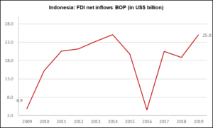However, Indonesia’s rising stature in the eyes of investors is truly represented in the figure below, which displays its FDI inflows relative to other attractive emerging economies in South East Asia. This data indicates that Indonesia has consistently been the market of choice for investors, with Vietnam following closely on its heels.