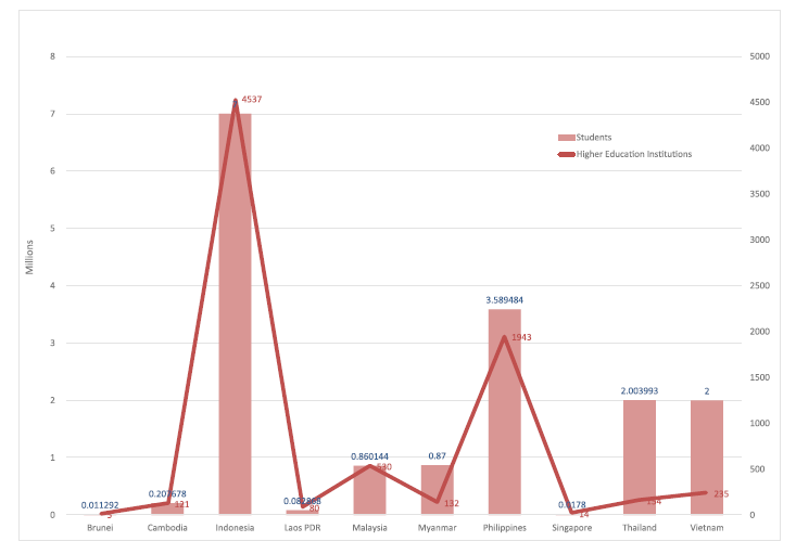 Compared to total student population in ASEAN, Indonesia, Philippines, Thailand and Vietnam have a higher number of student population with more than 7 million, 3.5 million, 2 million and 2 million students respectively every year. While Indonesia has a little more than 4500 higher education institutions, Vietnam with a third of the student population that of Indonesia, has only 235 higher education institutions. Philippines has close to 2000 and Thailand has 154 institutions.