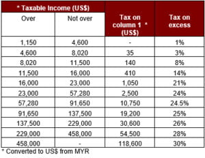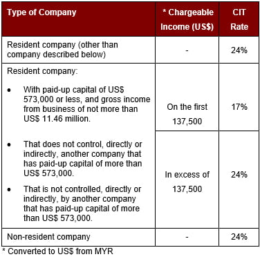 Corporate Income Tax – For both resident and non-resident companies, corporate income tax (CIT) is imposed on income accruing in or derived from Malaysia. The current CIT rates are provided in the following table: