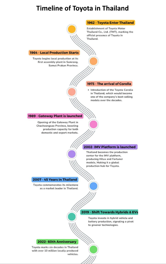 Toyota, an automotive manufacturer whose name is instantly recognized whenever Thailand’s automotive market is mentioned, has established a dominant presence in the country. Toyota entered the Thailand automotive market in 1962 through its subsidy Toyota Motors Thailand, their first production hub in Asia. Over the past 60 years, Toyota has earned its status as the nation’s top automotive brand. The journey to this point is a testament to strategic vision, adaptability, and a deep understanding of local needs.
