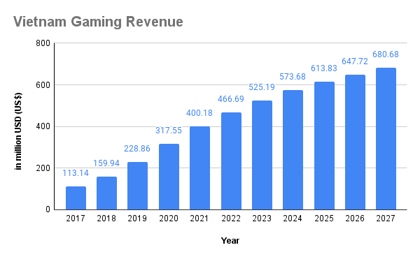 As seen in the chart above, Vietnam’s gaming industry is expected to have a revenue of 466 million US$ by the end of 2022. While this figure might seem small compared to the bigger nations around the world, given the low population of Vietnam, the per capita revenue puts the country in the forefront of Southeast Asia.